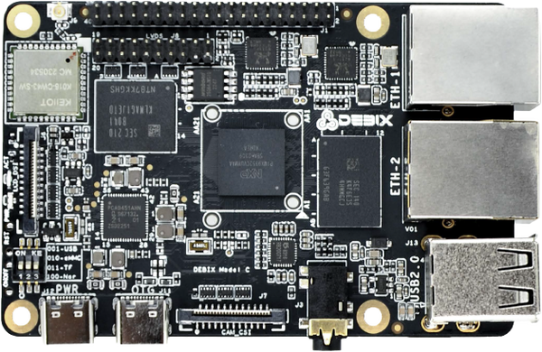 | Expansion | 40-pin double-row GPIO header: • 1× I2C, 1× UART (system debug) • 2× USB 2.0 Host • 4× 12-bit ADC input • 6× GPIO (configurable as PWM, UART, SPI, I2C, CAN) • 5V power in/out, 1.8V/3.3V @ 300mA out • System reset, ON/OFF |